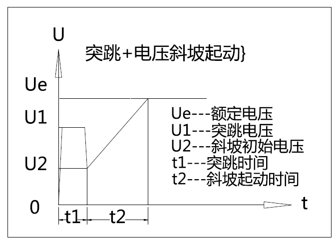在起動的初始階段給負載電機大的脈沖轉矩,其幅值和維持時間由參數“突跳電壓和突跳時間”決定,而后按照電壓斜坡起動的方式起動電機。