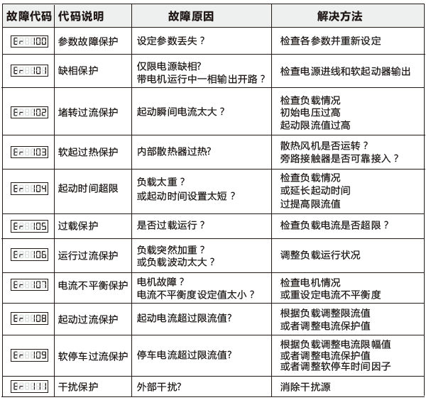 KSR系列200/201型軟起動器有11中保護功能,當軟起動器故障保護功能工作時,軟起動器立即停機,操作鍵盤顯示故障保護代碼,用戶可根據代碼所對應的故障原因進行分析處理。故障排除后,可通過外控“復位端子RET"或者鍵盤盒上的按鍵“STOP”(注:保持3秒)進行復位,使軟起動器回到起動準備狀態。