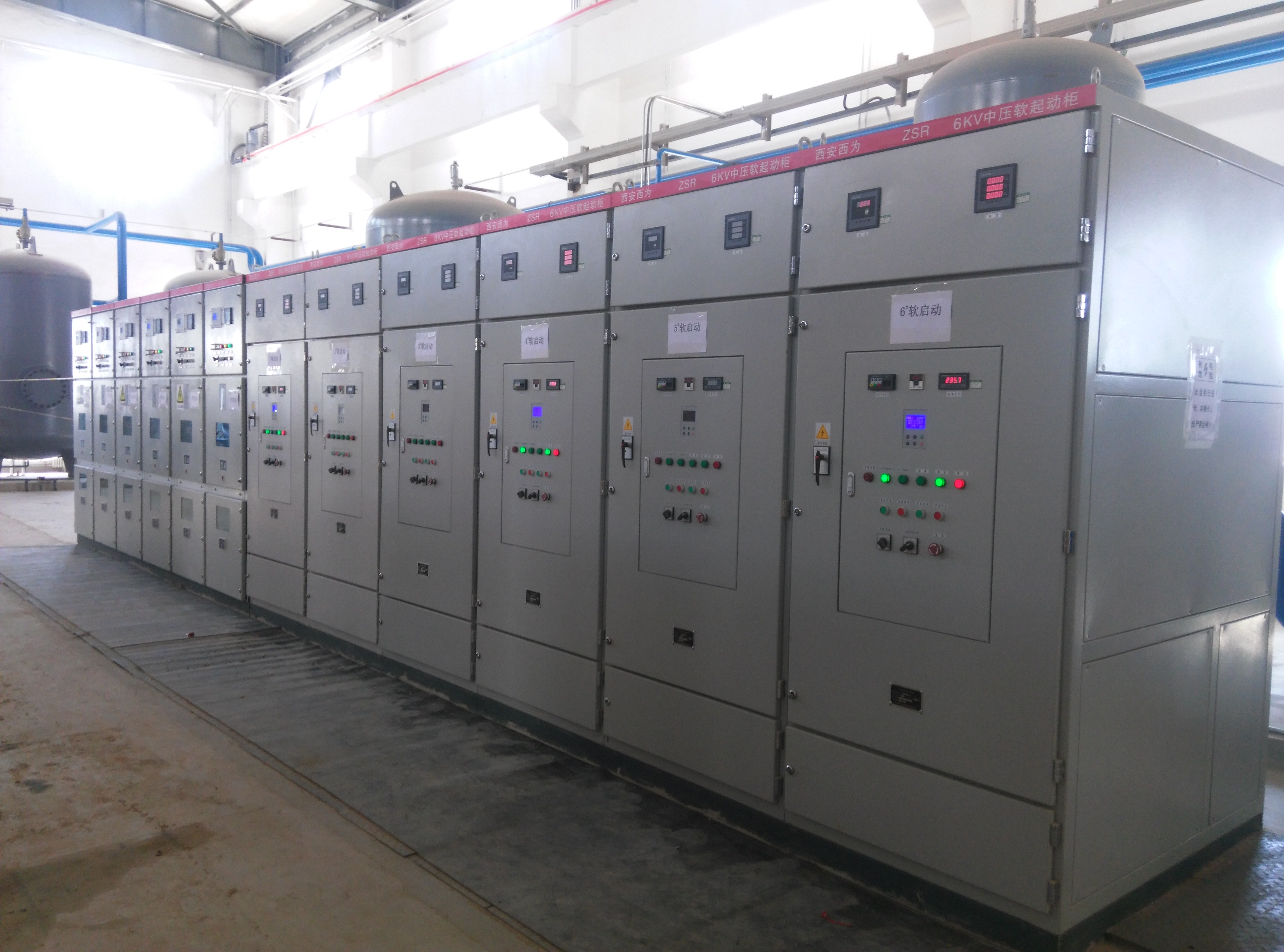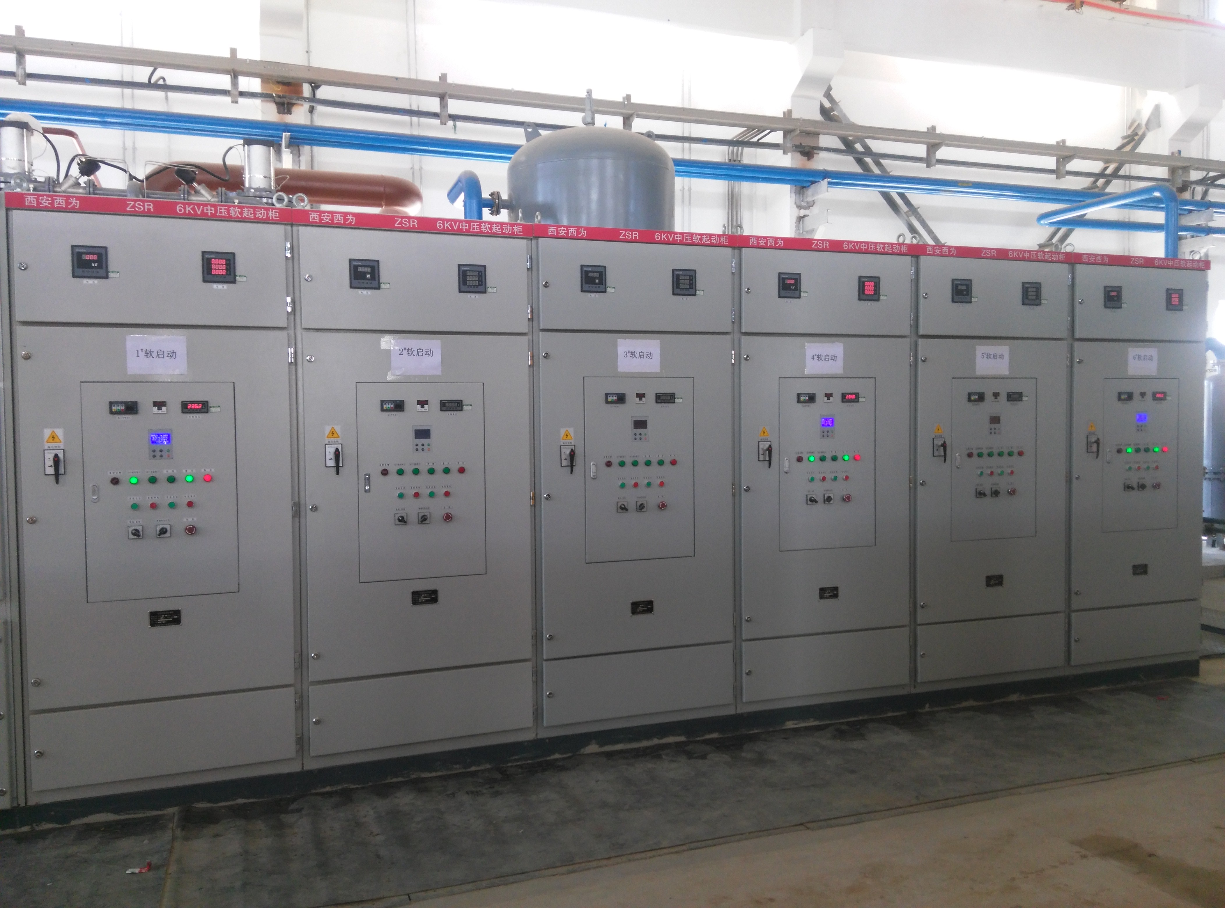西安西為電氣科技有限公司生產的ZSR系列中壓固態軟起動裝置是我們公司研制的新型軟起動裝置,本裝置采用DSP技術、光纖高速傳輸技術和現代先進控制理論而設計開發的高性能、多功能、高安全性的新型智能化設備、主要應用于對中壓電動機的起動、運行、停車的控制與保護。ZSR系列中壓軟起動裝置以高速數字信號處理器為載體,融入現代先進控制方法,配以高速可靠的光纖驅動和多種動態、靜態均壓保護措施,實現了裝置的高性能,裝置可以動態、實時、有效的將電動機起動時的電流限制在設定值以內、避免起動時電流過大引起電網電壓聚降,起動平穩,降低了變配電設備的容量,節約項目的投資項目。本所裝置具有可靠、準確的過流、過載、電流不平衡、缺相、晶閘管故障等全面的電動機保護功能。(以下是工程圖片)